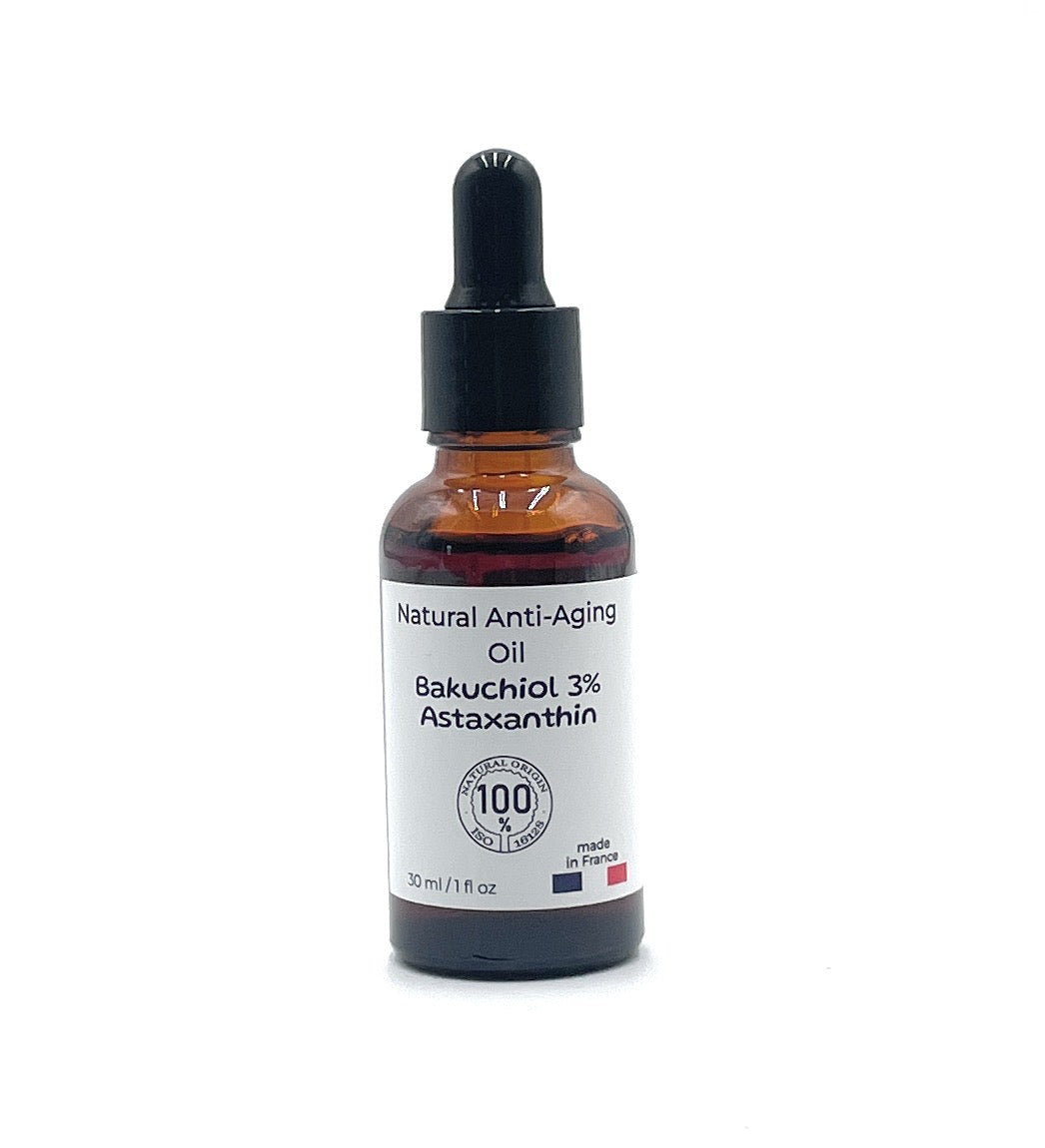Revitalize your skin with our Anti-Aging Oil. Infused with Bakuchiol, a natural extract with 3% concentration, it supports a youthful appearance without any side effects. With the powerful antioxidant Astaxanthin, known for its UV damage protection, and skin-like Squalane, this 100% natural and Cosmos certified oil will leave your skin feeling light, luxurious, and renewed. Vegan-friendly and effective, it's the ultimate addition to your skincare routine.