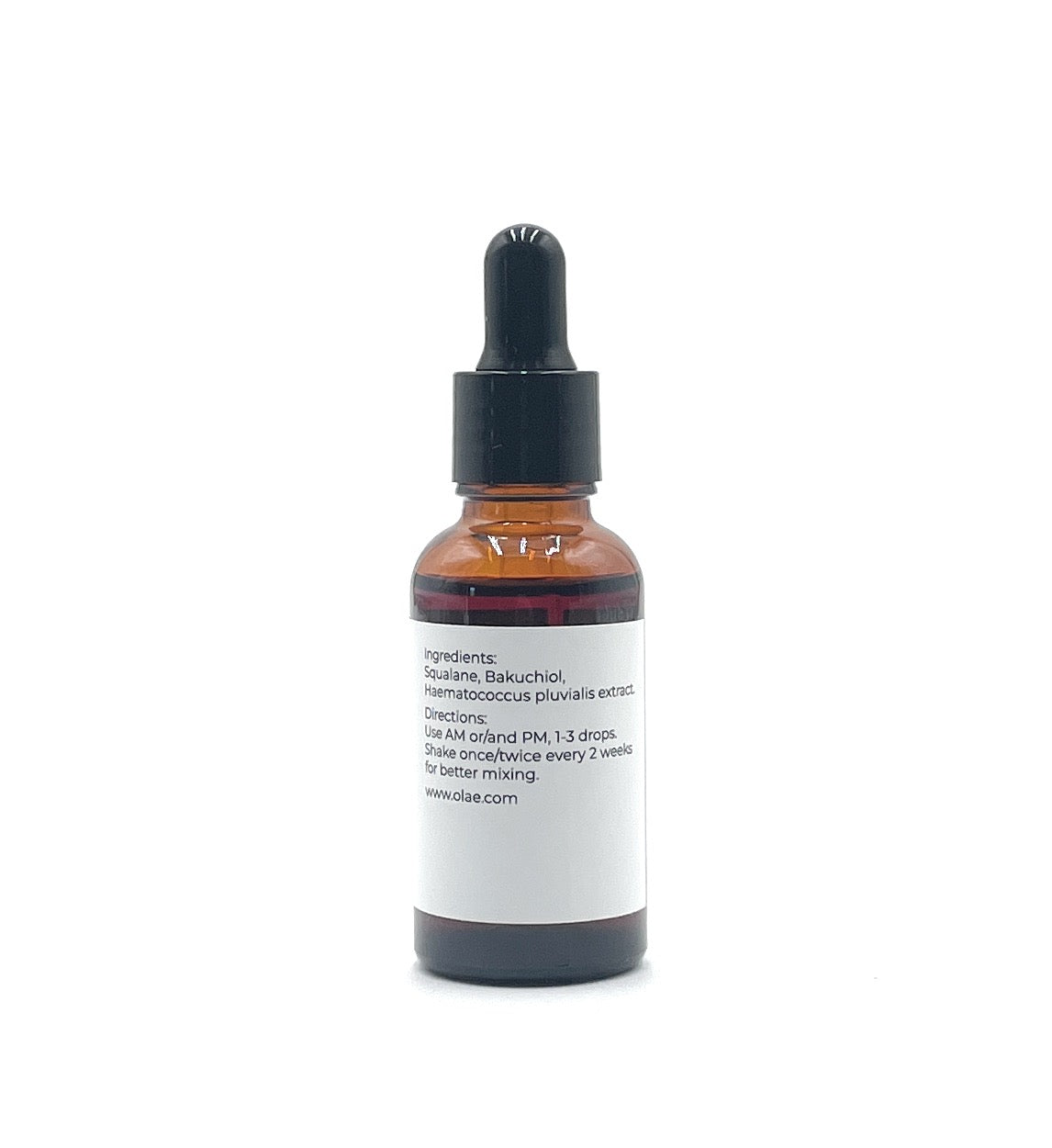 Ingredients: Squalane , Bakuchiol (pure molecule) , Haematococcus Pluvialis Extract (algae oleoresin with astaxanthin)