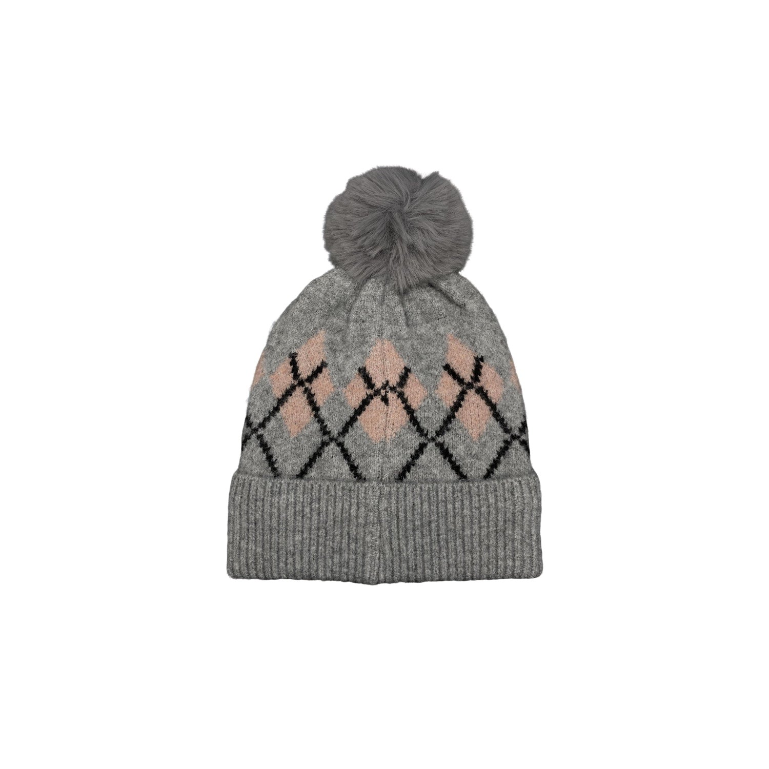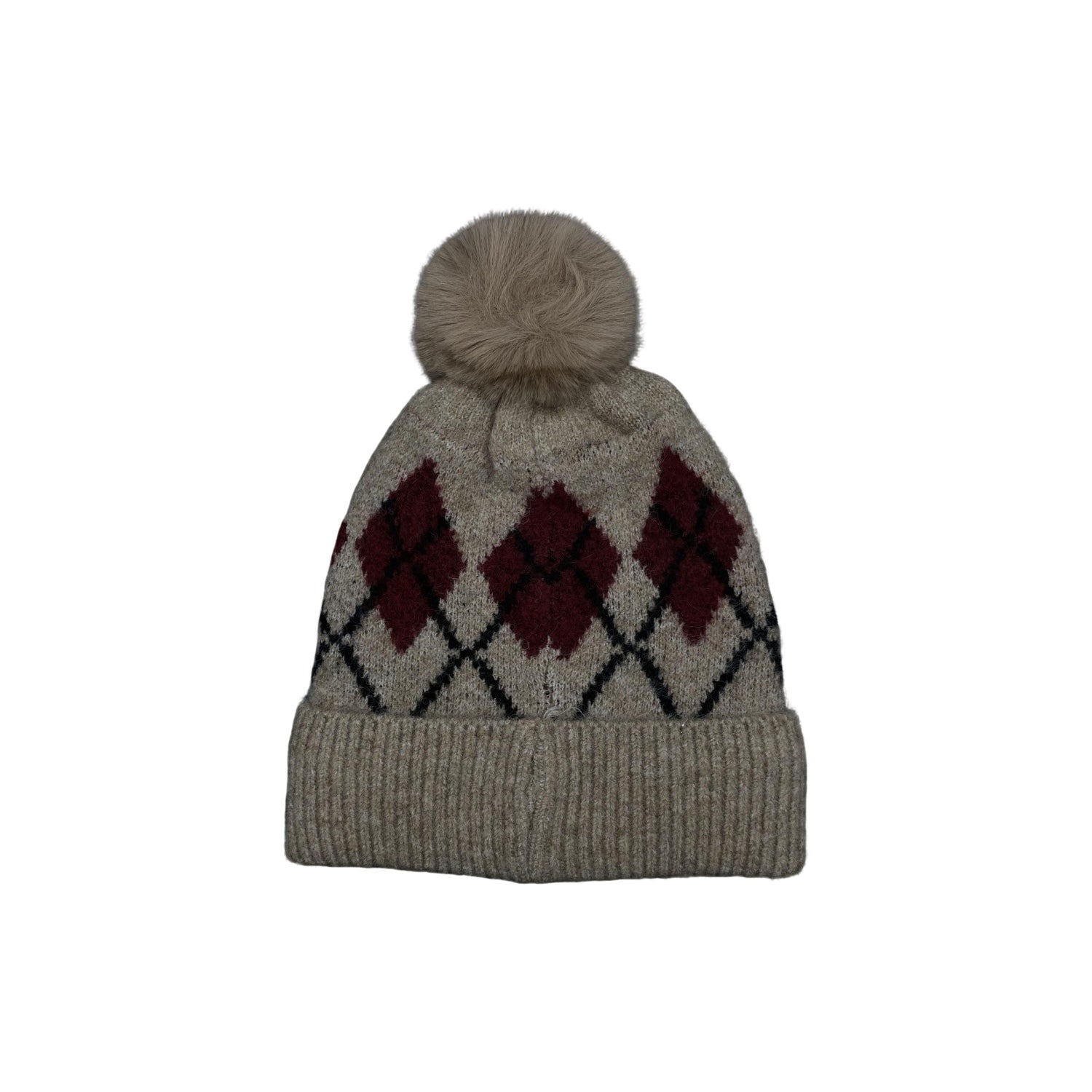 Wool Blended Argyle Fleece Pom Pom Beanie Winter Hat