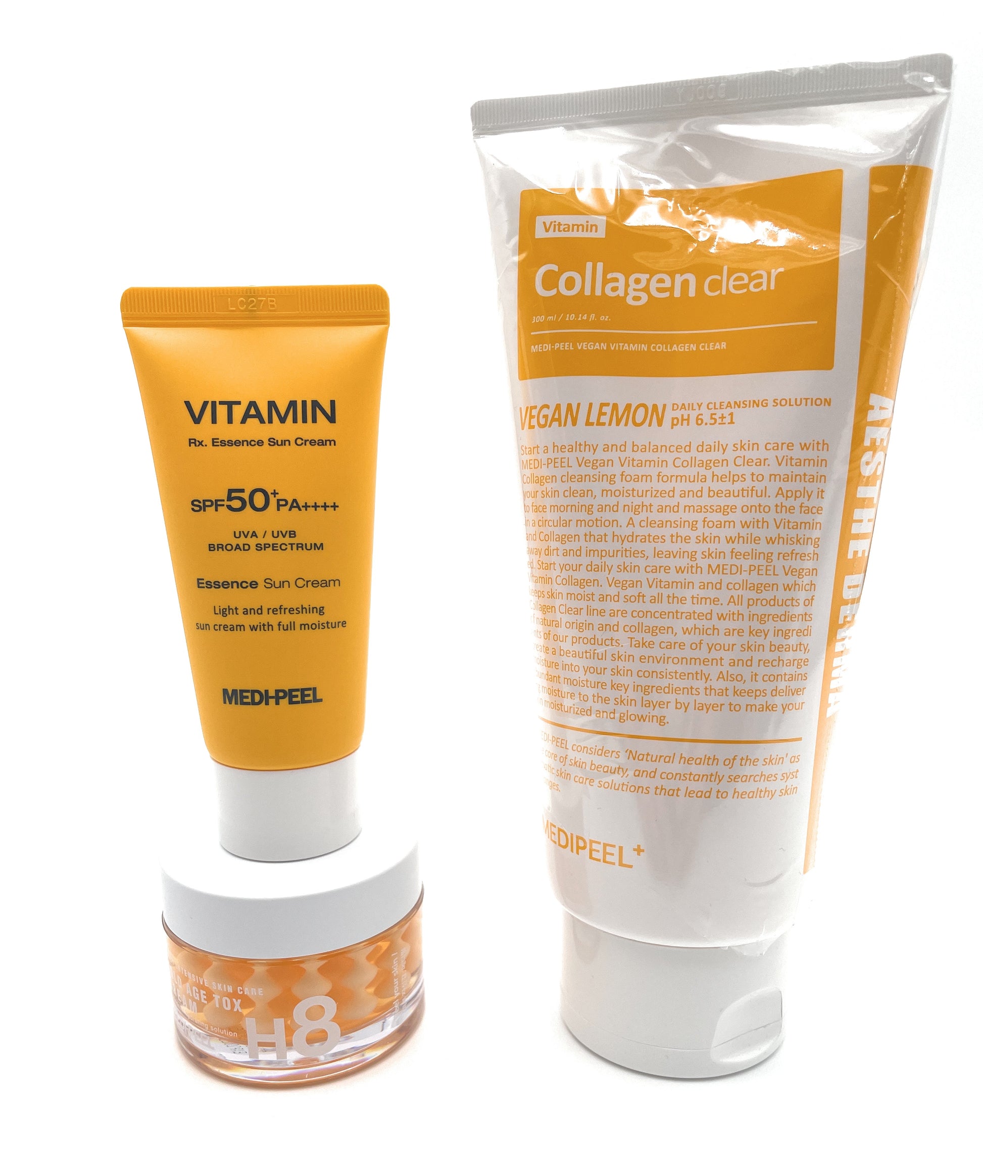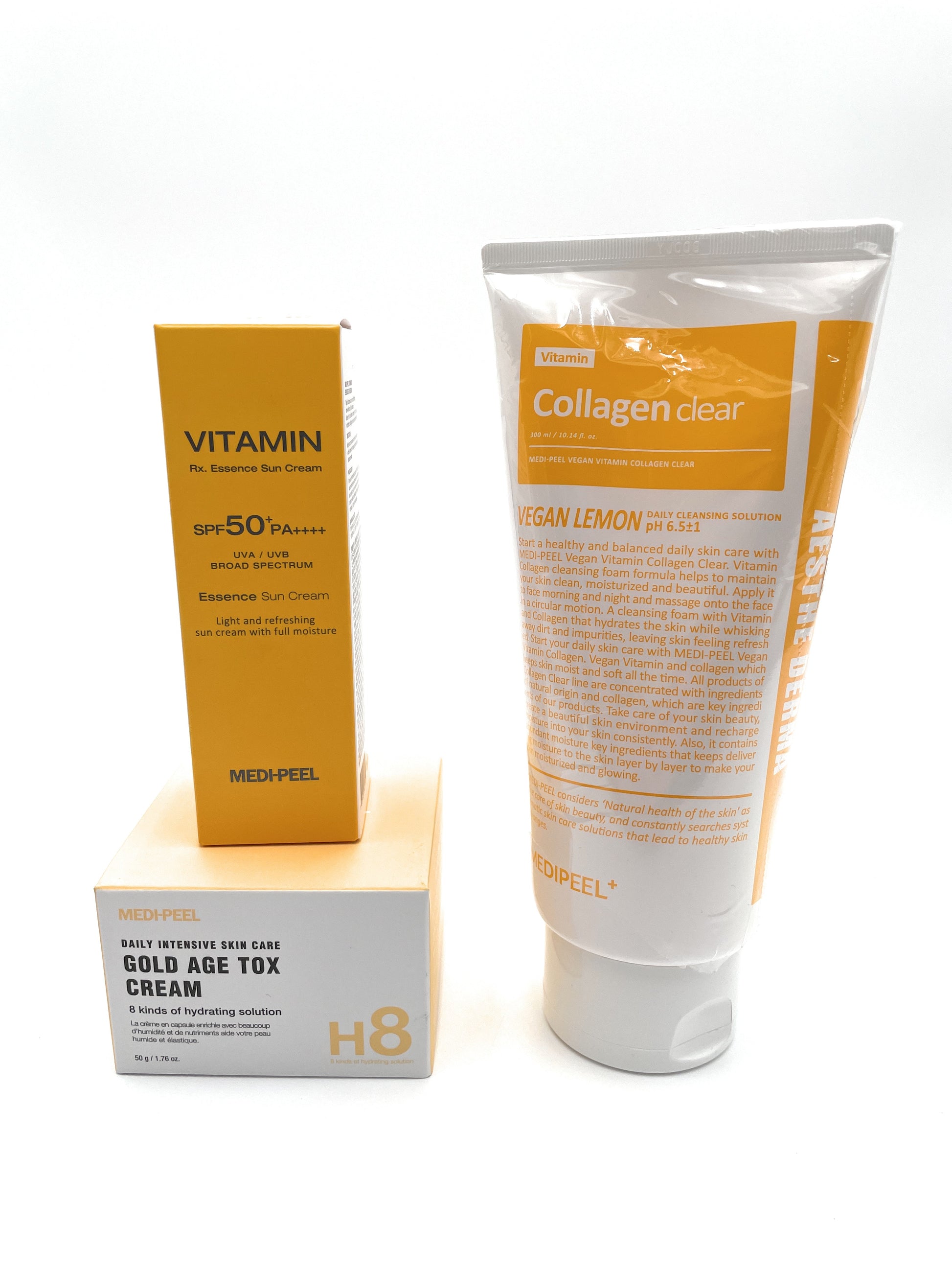 MEDI-PEEL Gold Age Tox H8 Cream, Vegan Vitamin Collagen Clear Cleanser & Vitamin Rx. Essence Sun Cream 50ml (SPF50+ PA++++) 3pc Set
