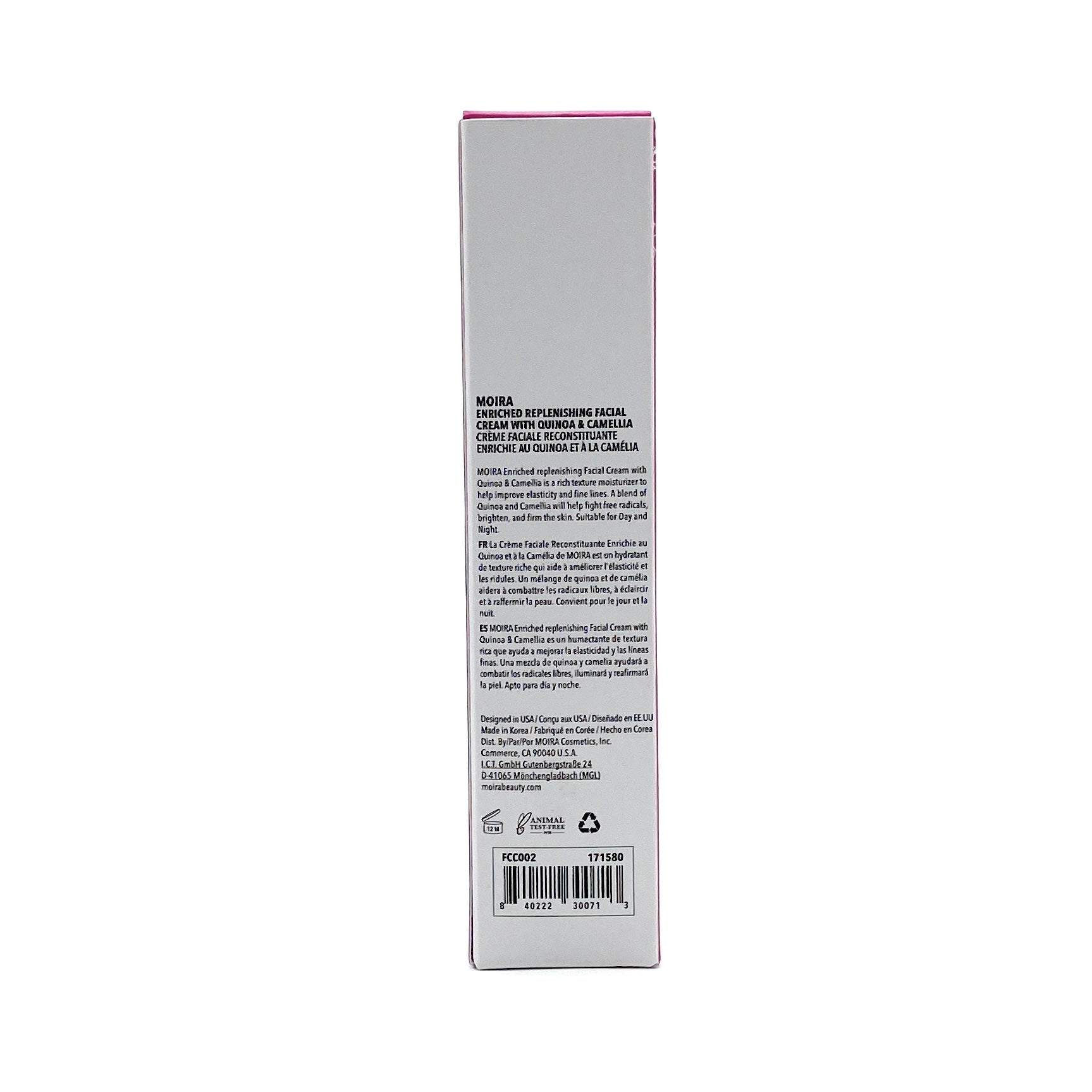 Introducing MOIRA Enriched Replenishing Facial Cream. This daily moisturizer features Quinoa and Camellia extracts to enhance your skin's appearance. Suitable for day and night use, this powerful formula tackles multiple skin concerns. Try it now for visibly smoother and healthier-looking skin.