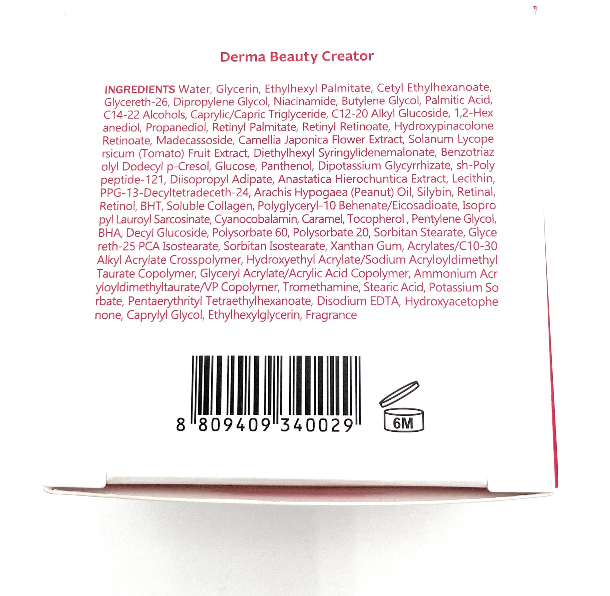 INGREDIENTS: Water, Glycerin, Ethylhexyl Palmitate, Cetyl Ethylhexanoate, Glycereth-26, Dipropylene Glycol, Niacinamide, Butylene Glycol, Palmitic Acid, C14-22 Alcohols, Caprylic/Capric Triglyceride, C12-20 Alkyl Glucoside, 1,2-Hexanediol, Propanediol, Retinyl Palmitate(10,000 IU/g), Retinyl Retinoate(30 ppb), Hydroxypinacolone Retinoate(10 ppb), Madecassoside, Camellia Japonica Flower Extract, Solanum Lycopersicum (Tomato) Fruit Extract, Diethylhexyl Syringylidenemalonate, Benzotriazolyl Dodecyl p-Cresol, Glucose, Panthenol, Dipotassium Glycyrrhizate, sh-Polypeptide-121(9,900 ppb), Diisopropyl Adipate, Anastatica Hierochuntica Extract, Lecithin, PPG-13-Decyltetradeceth-24,