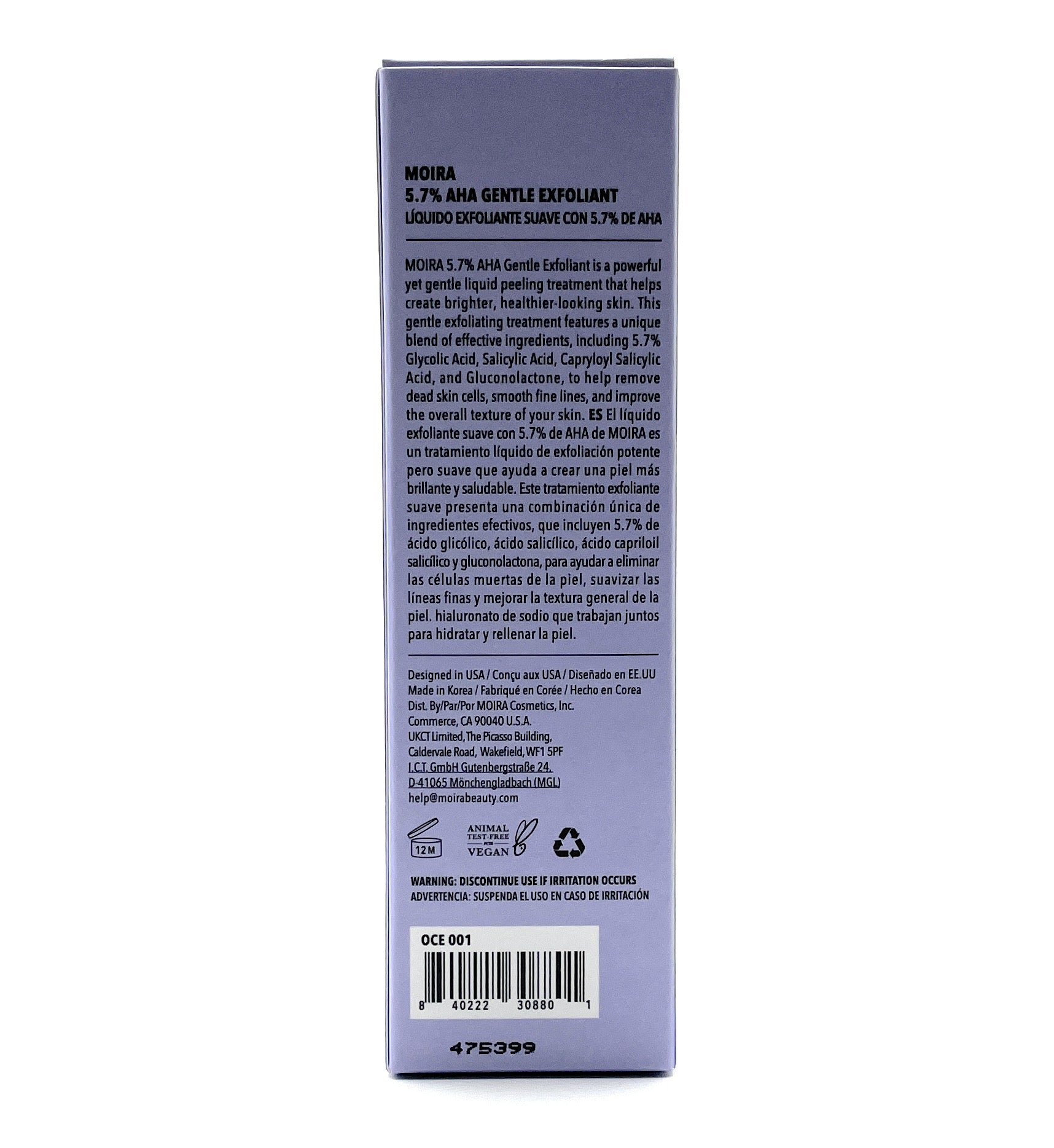 Transform your skin with MOIRA 5.7% AHA Gentle Exfoliant. This liquid peeling treatment boasts a potent blend of 5.7% Glycolic Acid, Salicylic Acid, Capryloyl Salicylic Acid, and Gluconolactone to gently exfoliate, revealing brighter and healthier skin. Say goodbye to dead skin cells, fine lines, and uneven texture for a flawless complexion.