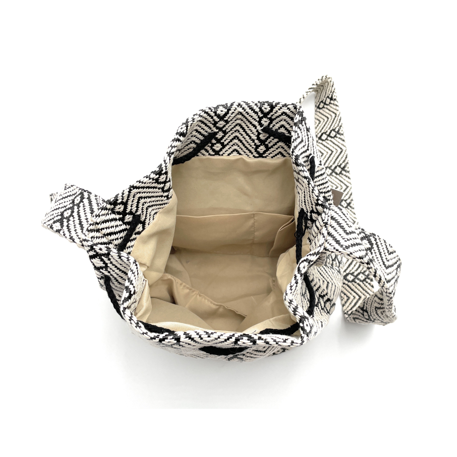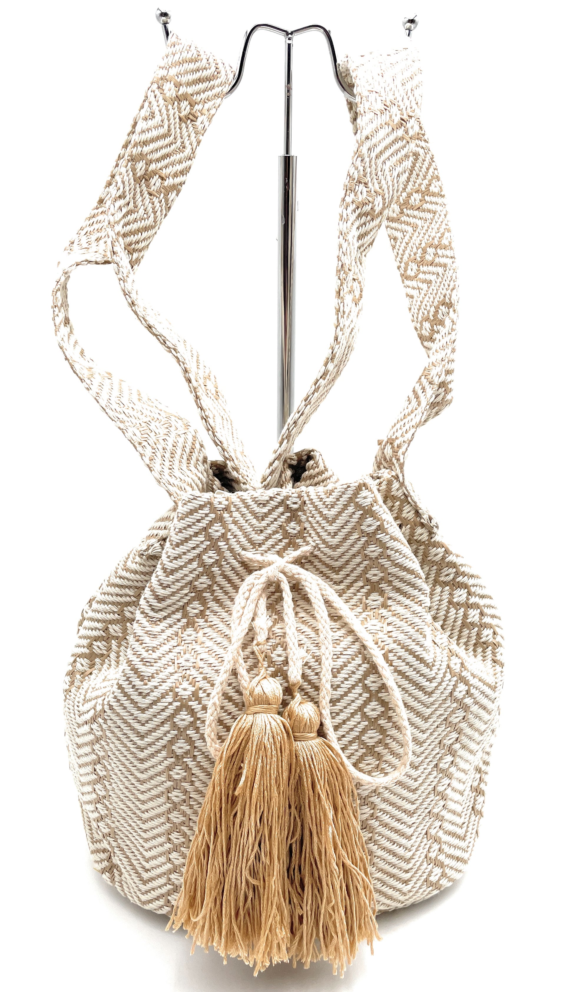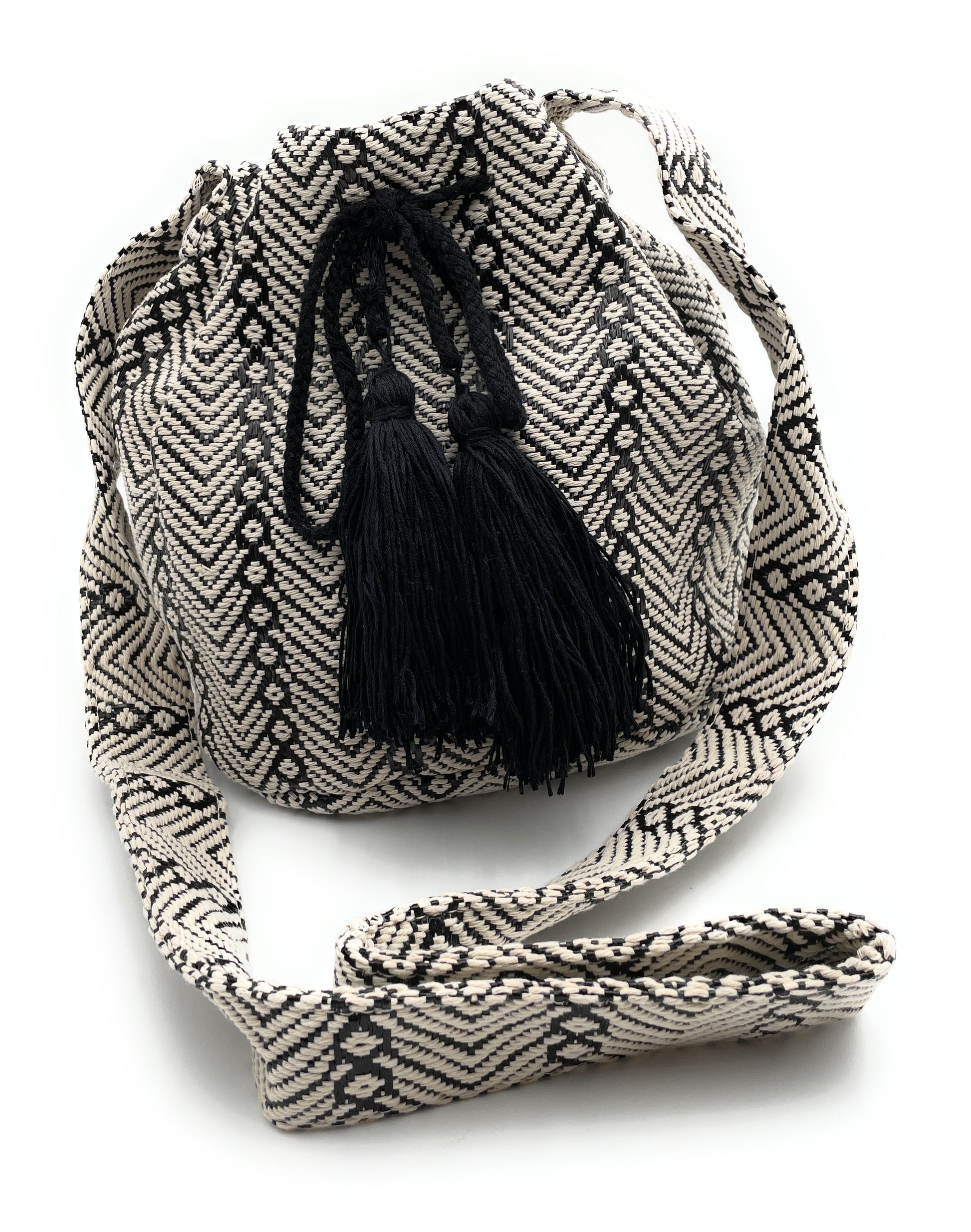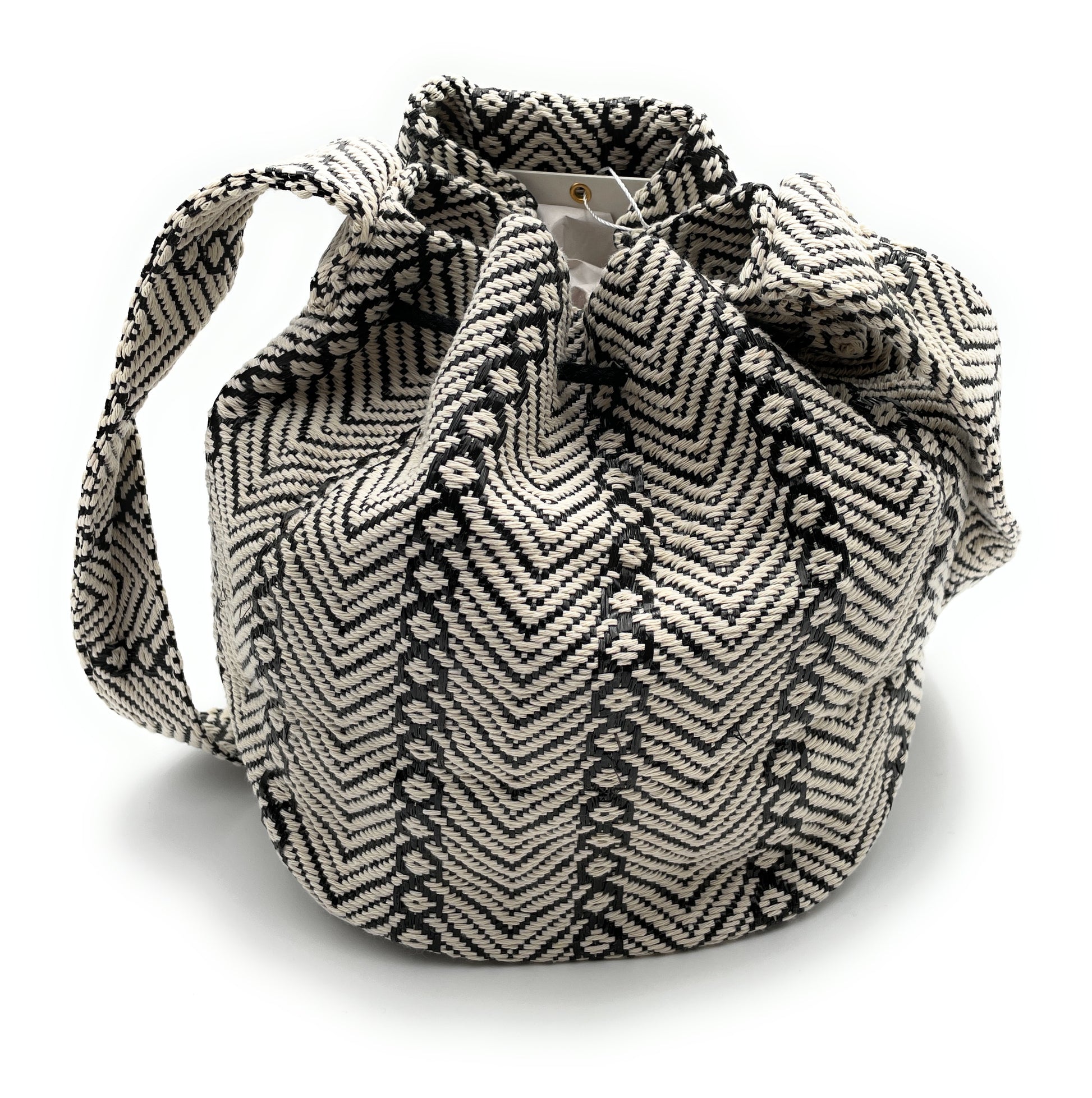 Crafted with a striking woven geometric pattern and finished with playful tassel details, this versatile bucket bag is designed to turn heads while keeping your essentials close at hand. The soft, structured shape and wide shoulder strap ensure all-day comfort, making it perfect for weekend getaways, festivals, brunch dates, or everyday errands.