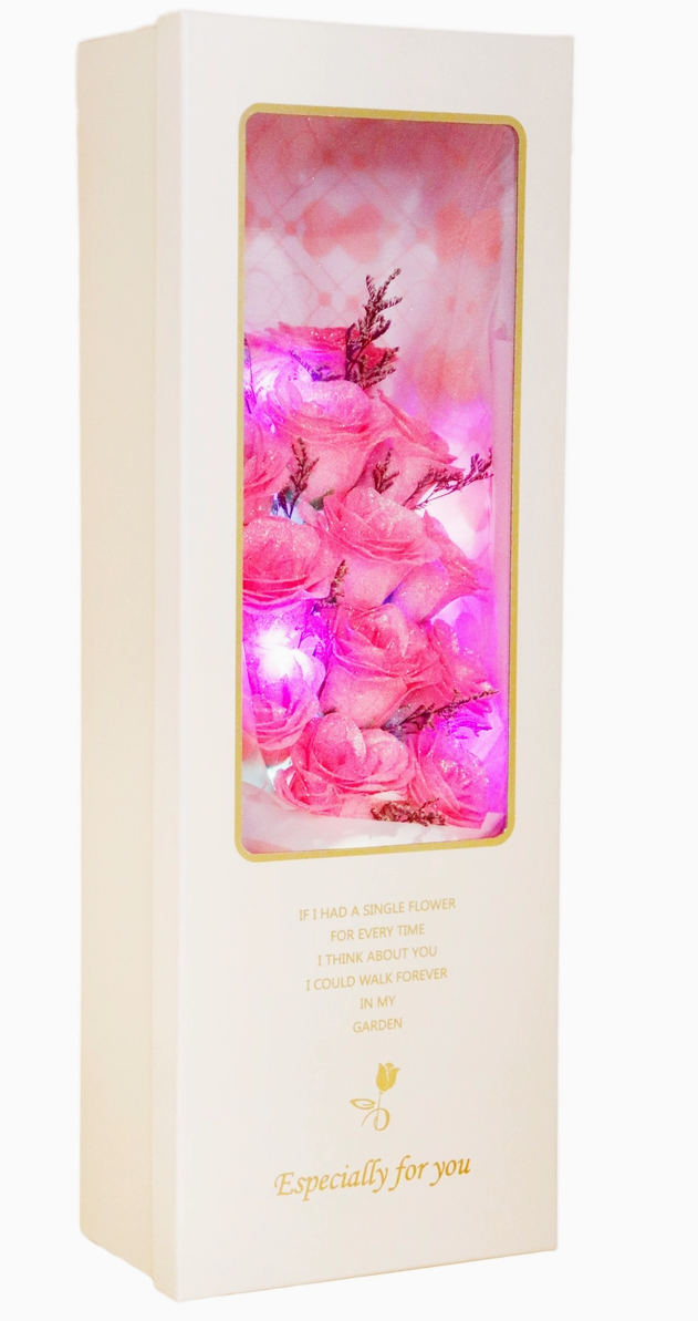 Light up their Valentine's Day with our Glitter Shimmer Led Light Soap Rose Bouquet Gift Box. The shimmering LED lights add a touch of magic to these beautiful soap roses. A perfect gift for the ones who light up your life.