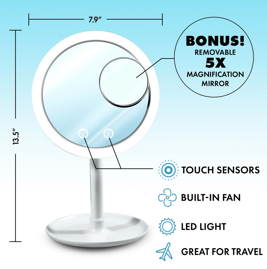 Its powerful fan circulates a 360° gentle breeze, ensuring a sweat-free makeup application. With 5x magnification and LED lighting, get a perfect look every time. Your new go-to for an effortless and flawless beauty routine.