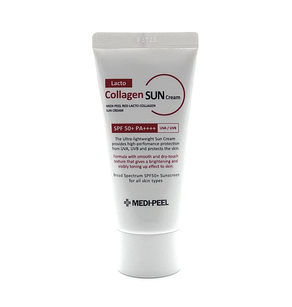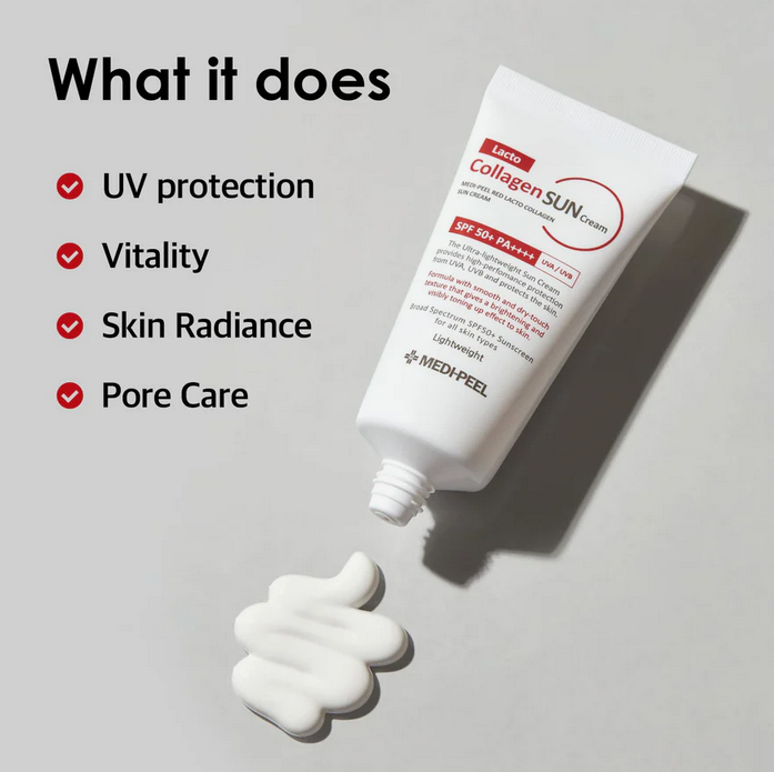 MEDI-PEEL-LACTO COLLAGEN SUN CREAM- SPF 50+PA+++ is your best companion for sun protection! Keep your pores clean and oil-free with our oil control system for a smooth and bright skin tone. Our unique formula, including Lactobacillus Fermented Product and low-molecular-weight collagen, cares for pores and delivers deep hydration. Get ultimate protection with SPF50+PA++++ against harsh UV rays. Ideal for oily and combination skin.