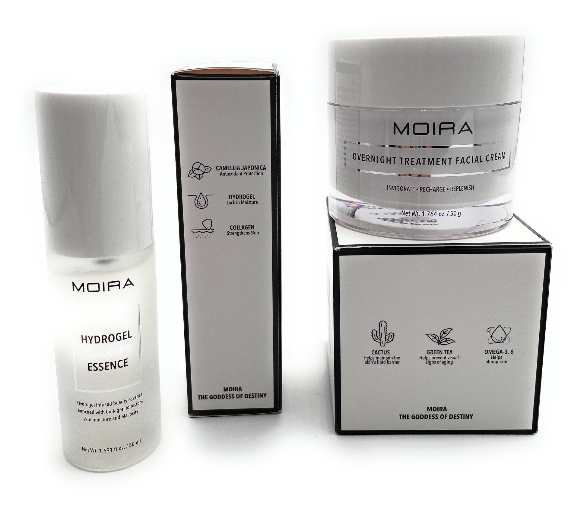 Achieve silky soft, youthful skin with MOIRA's Overnight Treatment Facial Cream and Hydro-gel Collagen Essence set. This non-comedogenic formula with cactus and green tea extracts, 11 natural plant oils, and omega fatty acids nourishes and regenerates skin while you sleep. Combined with the powerful hydration and repair of the Hydro-gel Collagen Essence, experience a radiant, elastic complexion. Wake up to healthier, glowing skin.