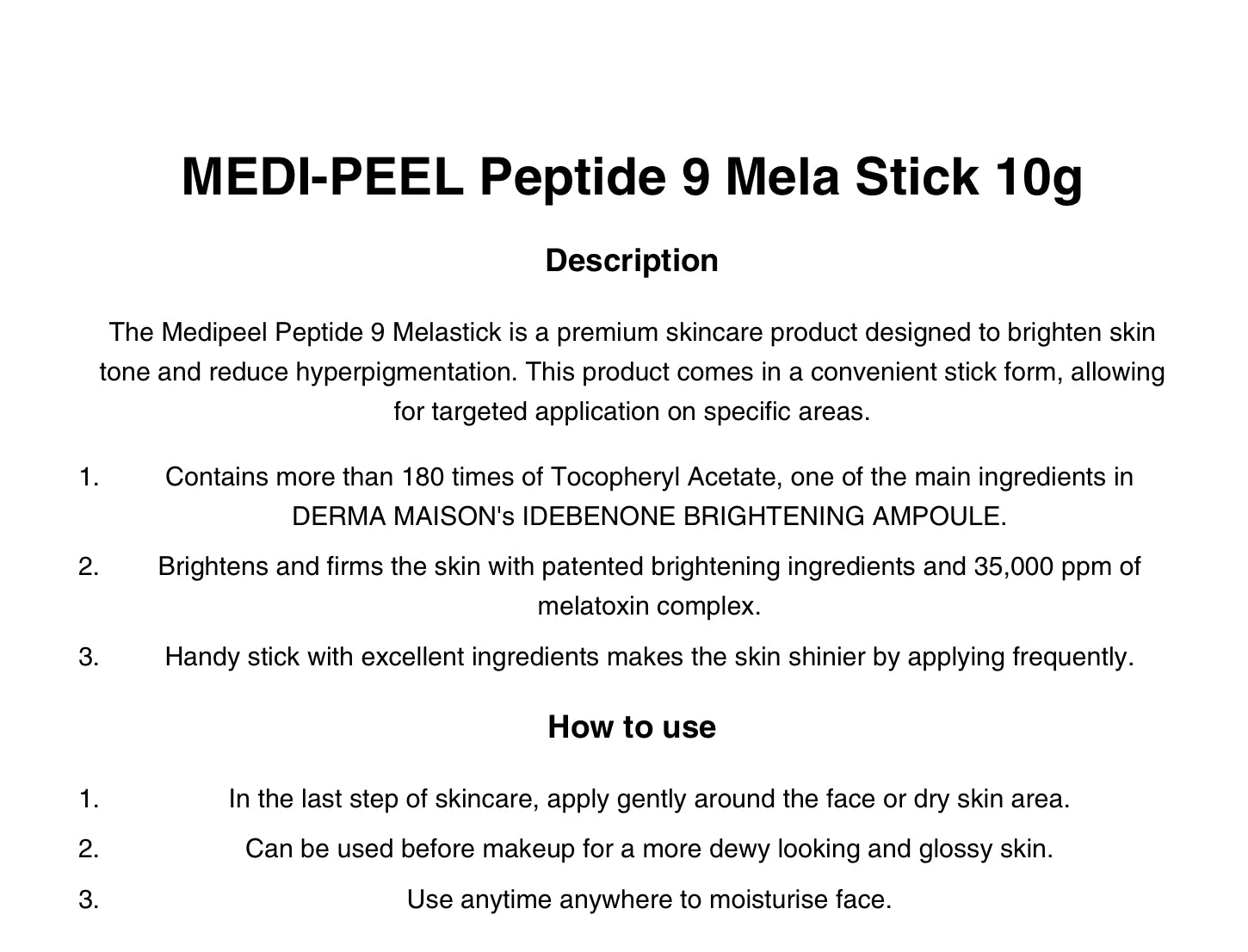 Transform your skin with Peptide 9 Mela Stick, a highly concentrated multi-care stick that addresses hyperpigmentation, freckles, and wrinkles with just one touch. Experience the benefits of brightening and anti-wrinkle solutions for dull, dark, and dry skin in need of intensive care. Elevate your skincare routine with this exclusive and luxurious product.
