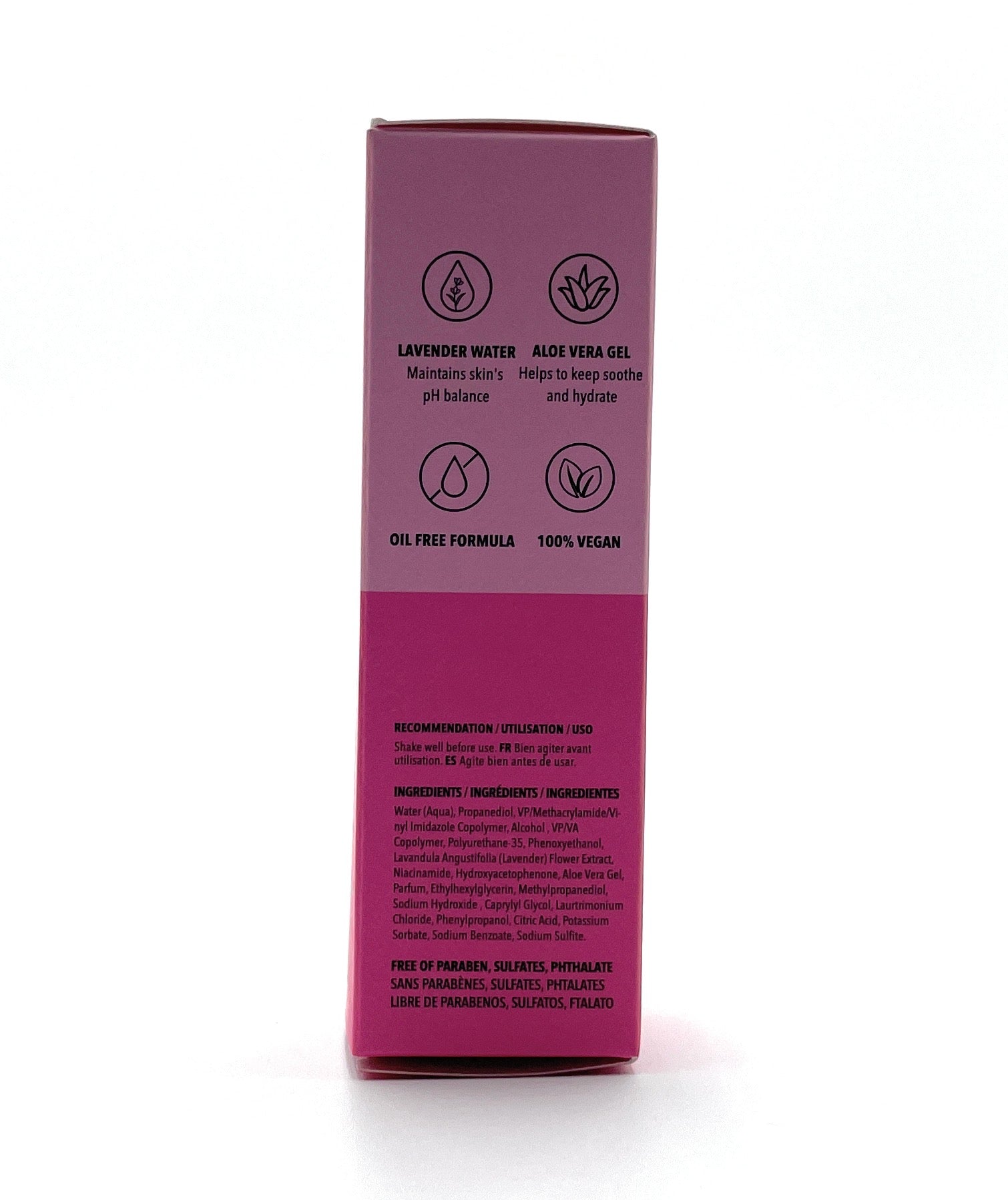 Ingridients: Water (Aqua), Propanediol, VP/Methacrylamide/Vinyl Imidazole Copolymer, Alcohol, VP/VA Copolymer, Polyurethane-35, Phenoxyethanol, Lavandula Angustifolia (Lavender) Flower Extract, Niacinamide, Hydroxyacetophenone, Aloe Vera Gel, Parfum, Ethylhexylglycerin, Methylpropanediol, Sodium Hydroxide, Caprylyl Glycol, Laurtrimonium Chloride, Phenylpropanol, Citric Acid, Potassium Sorbate, Sodium Benzoate, Sodium Sulfite.
