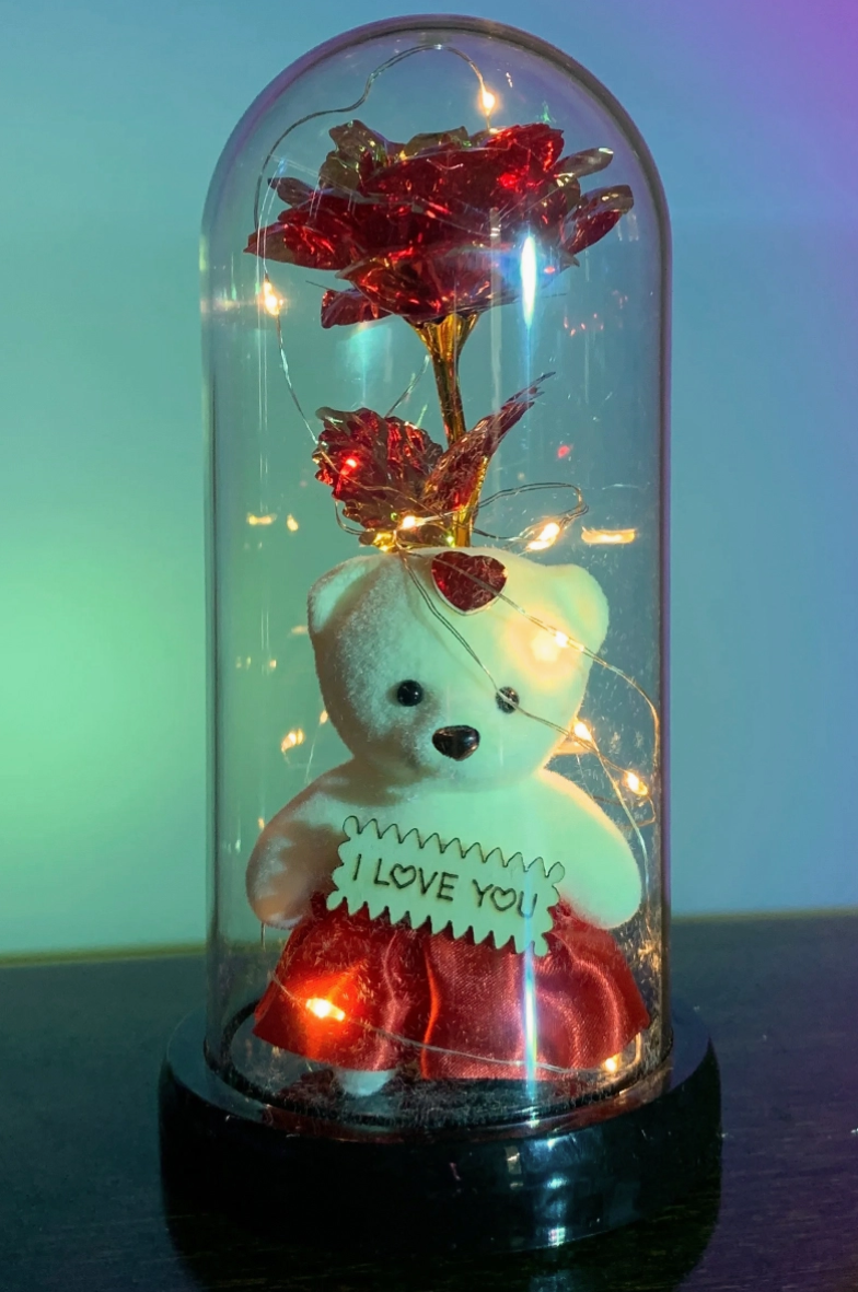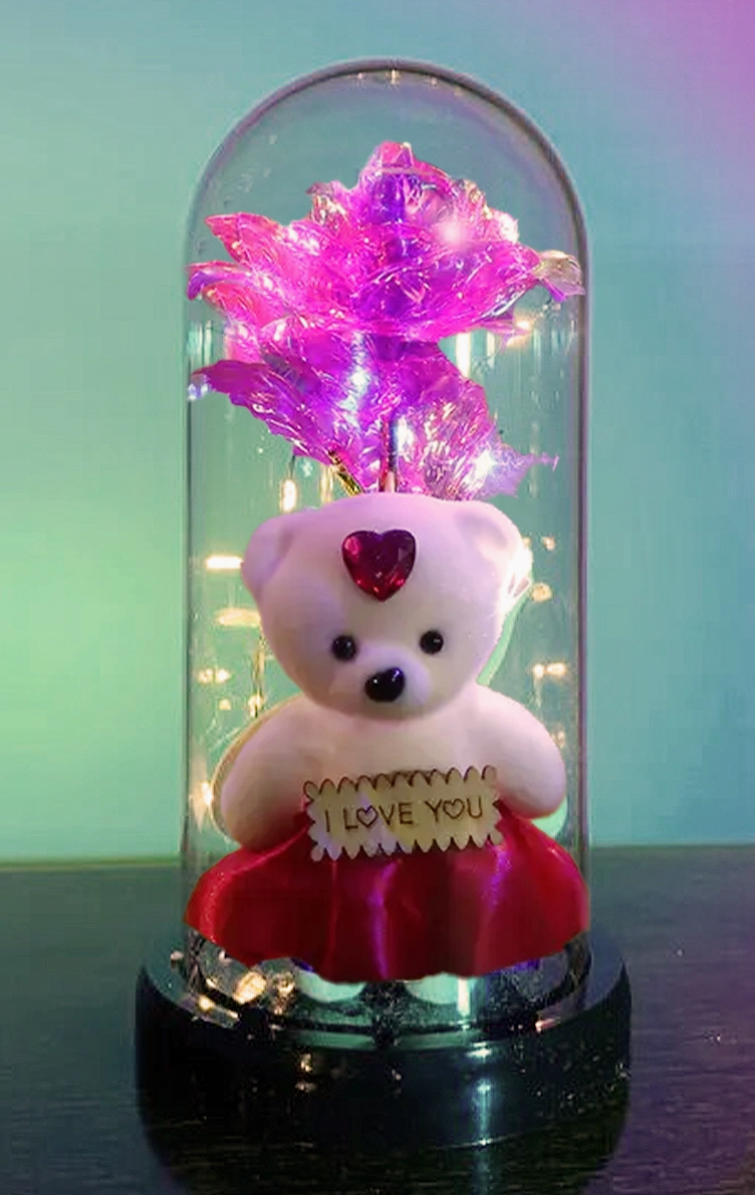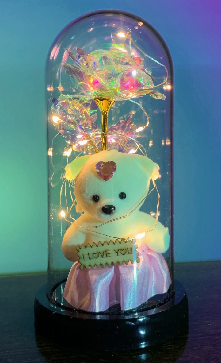 Create a romantic ambiance with our Teddy Bear Galaxy Rose Glass Dome Led Light. This unique Valentines Day gift features a stunning galaxy rose enclosed in a glass dome with LED lights. Show your love in a quirky way with our Teddy Bear Galaxy Rose Glass Dome Led Light!
