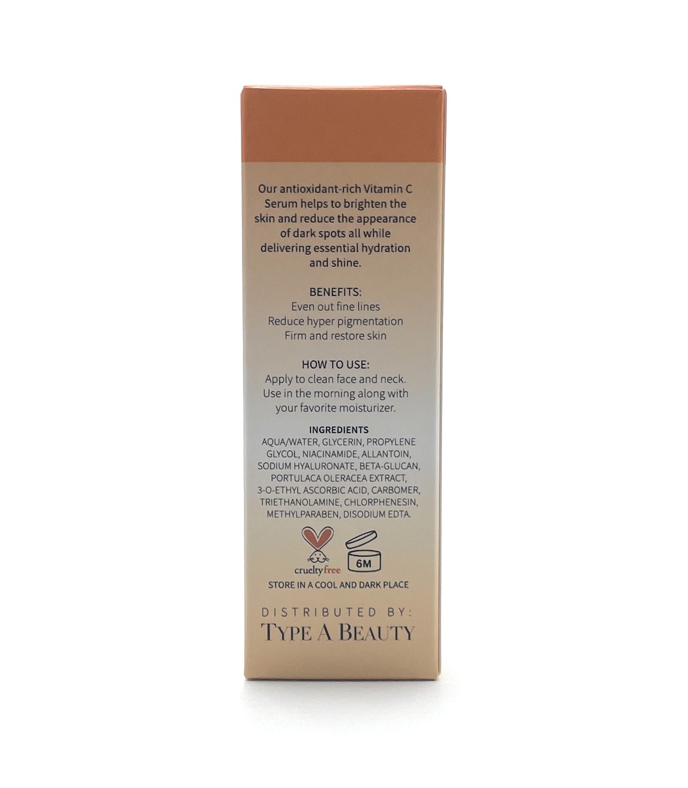 Lighten dark spots and hydrate your skin with Type A Beauty's Vitamin C Serum. Boosting brightness and delivering essential nourishment, this antioxidant-rich formula revitalizes your complexion for a radiant glow. Visibly brightens to even skin tone. Helps restore the protective skin barrier.