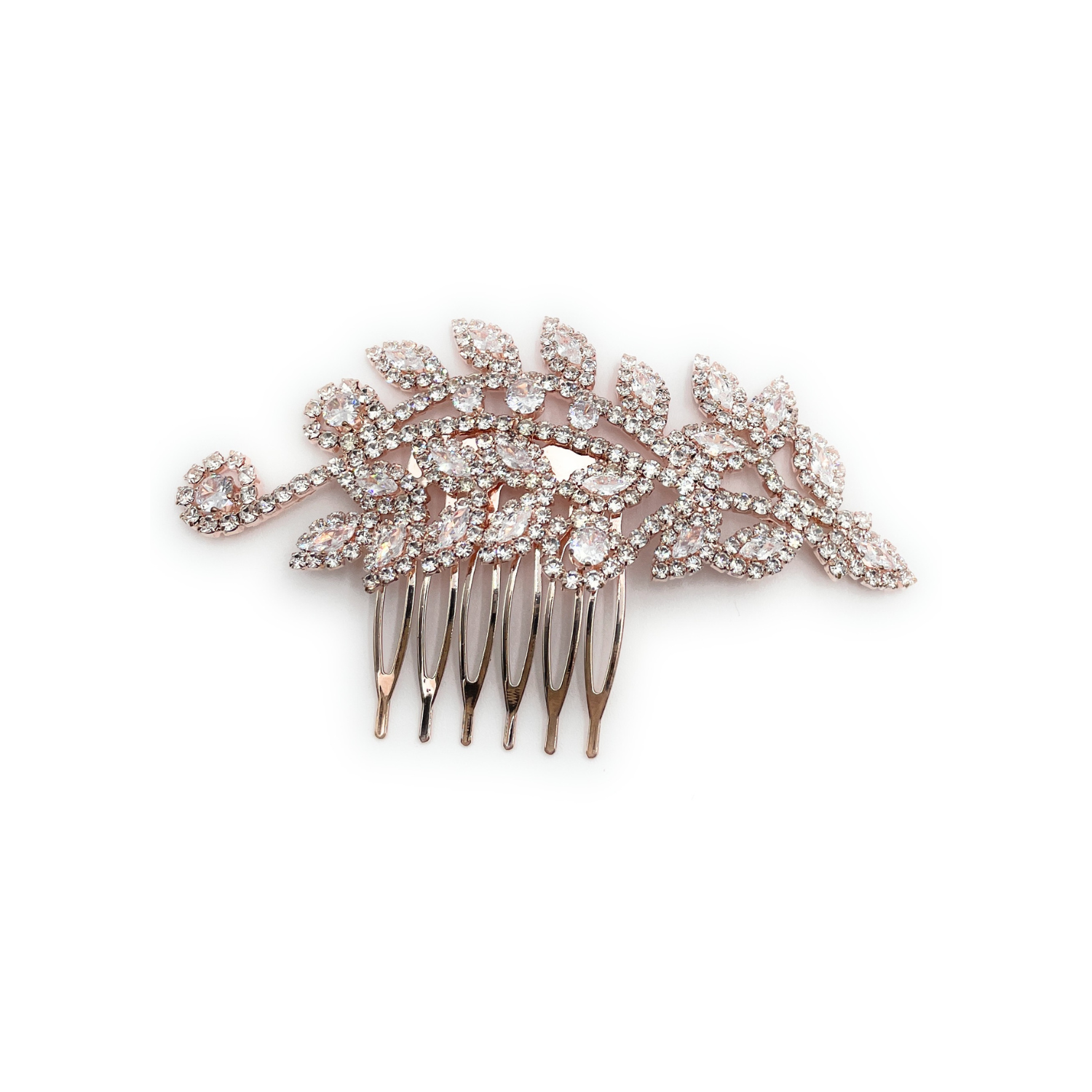 This luxurious rose gold hair comb is elevated with a subtle array of sparkling crystal studs. Perfect for making any formal look shine, this elegant accessory adds a special something to your wedding day or special occasion ensemble.